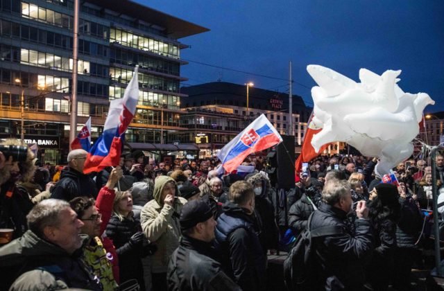 „Želám si, aby sa opäť zostavila vláda, ktorá bude vedieť povedať hrdo Američanom nie,“ povedal Danko. Ľudia na zhromaždení držia transparenty s nápismi „Nie vojne!“, „Slovania spojme sa!“, „Čaputová chce vojnu s Ruskom“ alebo „Yankee go home“.